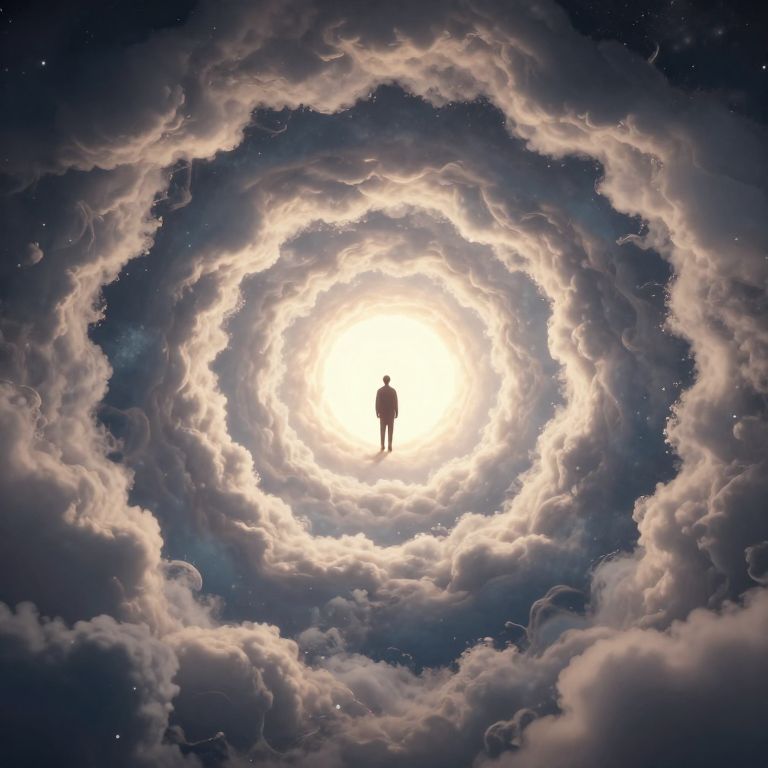A solitary figure stands at the threshold of an infinite spiral, where the ethereal glow of concentric clouds whispers the secrets of time and space, inviting introspection into the boundless mysteries of existence.
