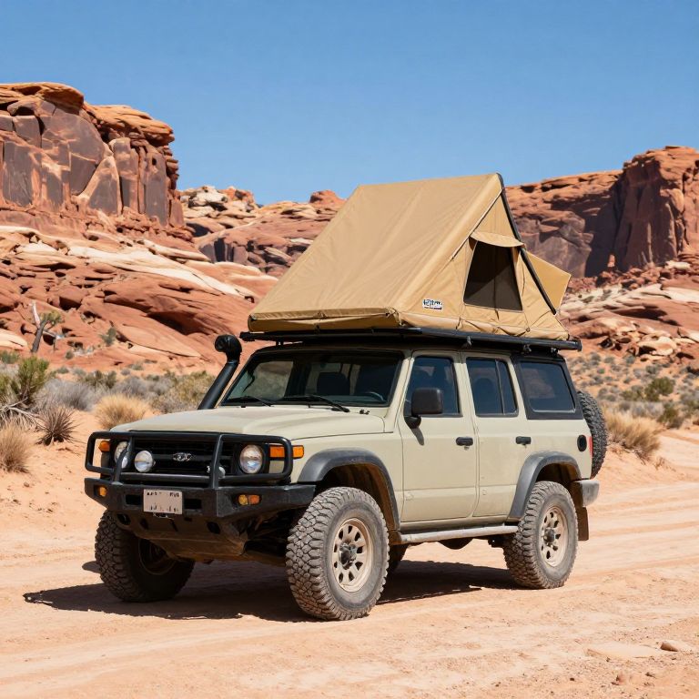 Adventure unfolds as a rugged off-road vehicle, equipped with a tan canvas roof tent and branded \"LEAND RICTIS,\" traverses the dusty trails of Moab's iconic desert landscape, framed by towering red rock formations under a clear blue sky.