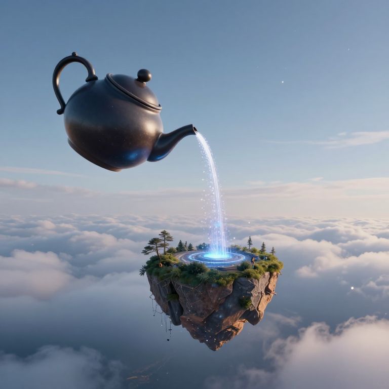 A surreal digital artwork depicts a floating, metallic black teapot pouring a glowing blue stream of liquid onto a small, verdant, cliff-like island surrounded by clouds. The teapot hovers in the upper left, with a curved spout and handle. The island, covered in green grass and small trees, has a circular blue light at its center. The sky is clear and bright, with a gradient from blue to white. The image blends fantasy and realism, creating a whimsical, ethereal scene.