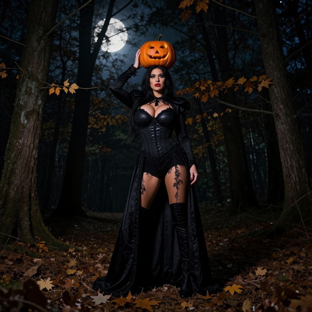 A person in a black costume is standing in a forest with a pumpkin on his head. The person is a tall, attractive woman with big tits and a sexy demeanor, wearing a dark, intricate costume that blends with the forest shadows. She stands confidently under a moonlit sky, surrounded by tall trees and autumn leaves, with a pumpkin on her head that glows faintly in the darkness. The scene is filled with a mysterious and eerie atmosphere, emphasizing the supernatural elements of the Halloween night.