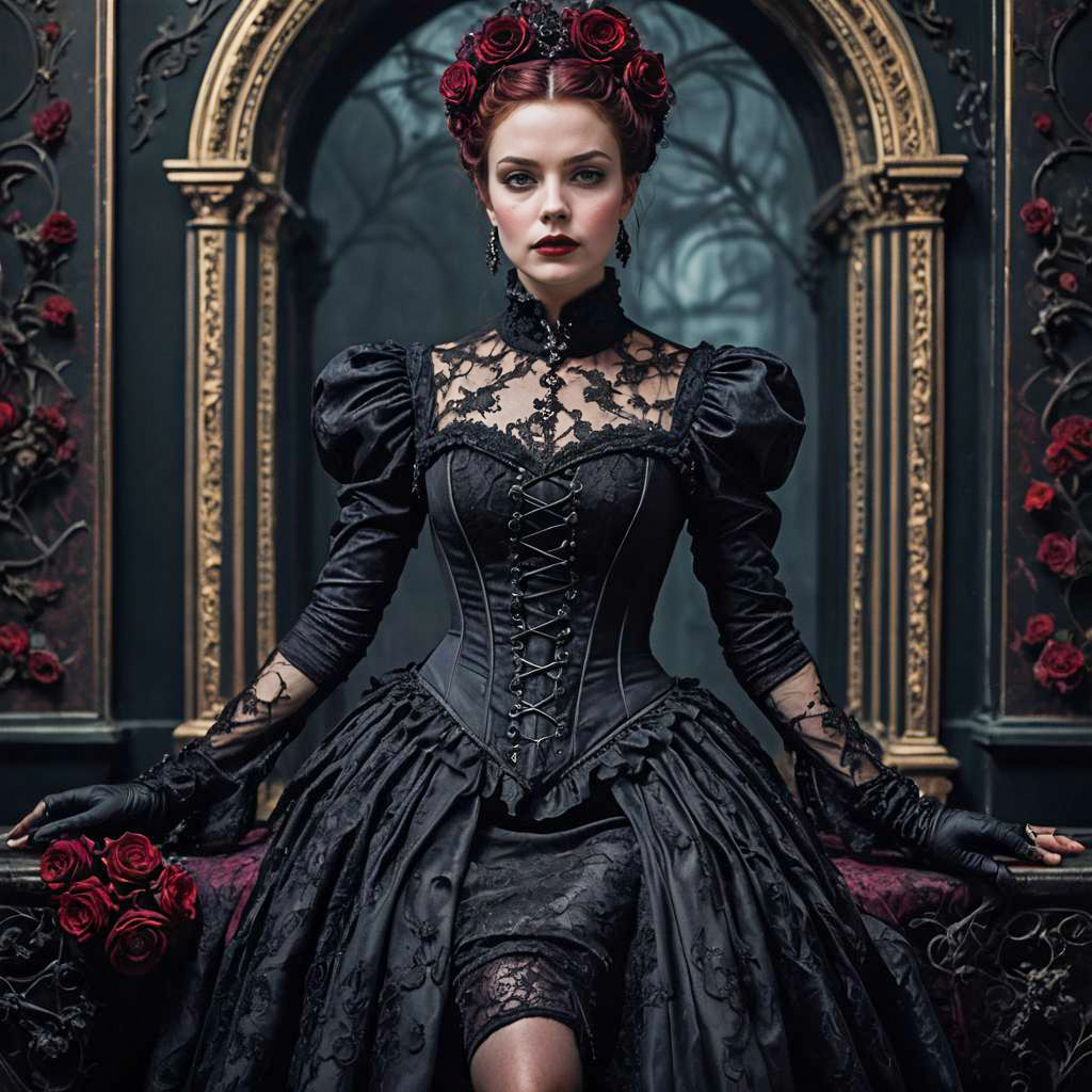 Photo of a Long Arms woman, Messy Bun, gothic romance outfit, black Aubergine lace dress, Wool-silk blend corset, dark red roses, silver jewelry, Victorian style, leather boots, dramatic makeup, moody, elegant, mysterious, Theater, intricate lines