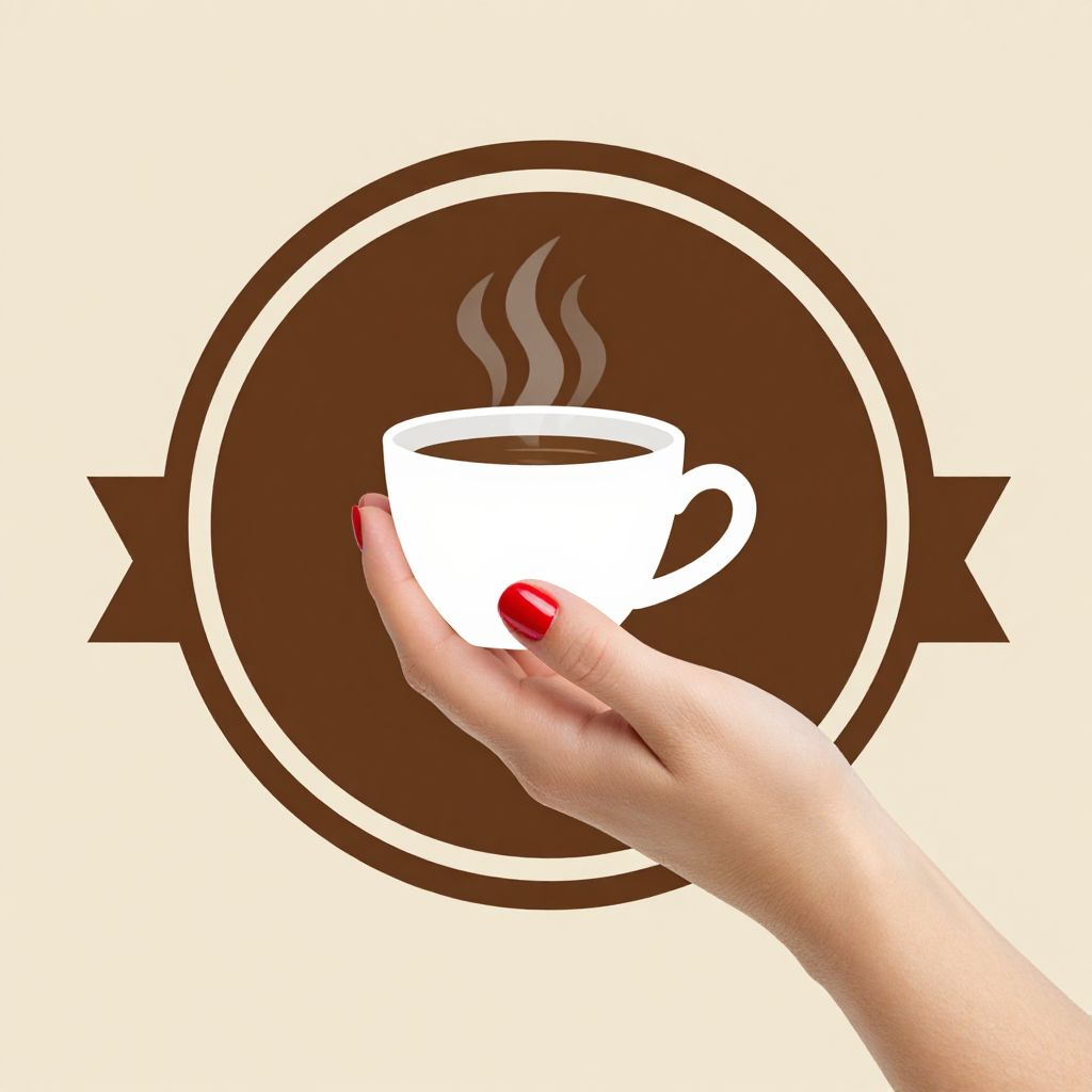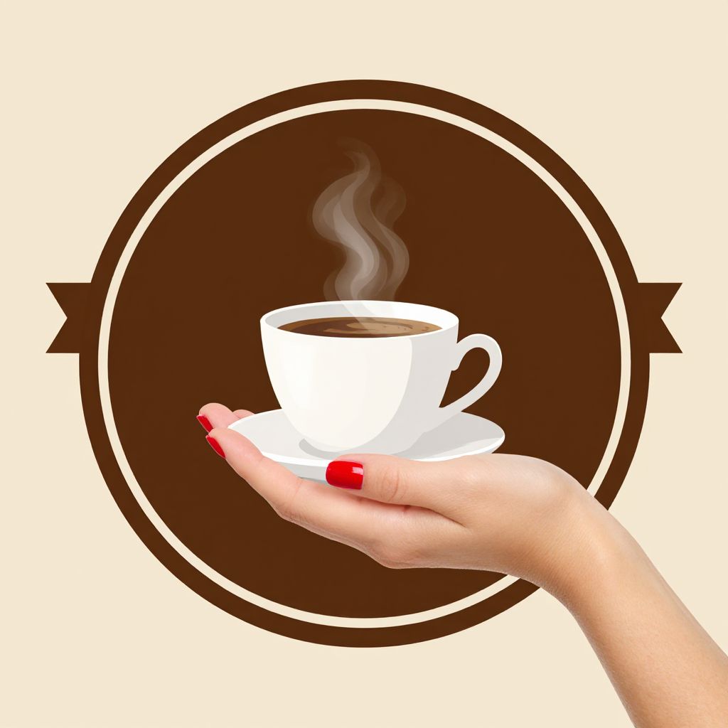 Retro-style round brown label featuring a ribbon banner and a woman's hand with red nail polish delicately holding a steaming white coffee cup against a beige background.
