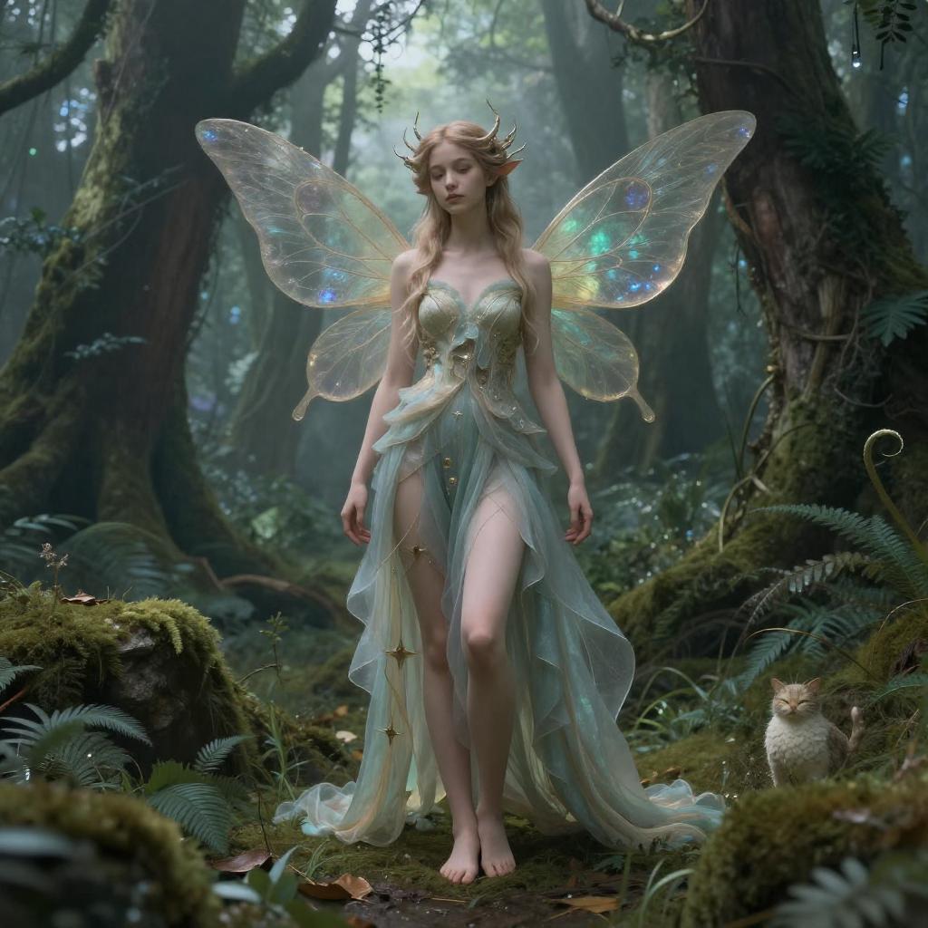 Modelshoot style, (extremely detailed CG unity 8k wallpaper), full body shot of ethereal forest nymph, misty enchanted woodland glade, professional majestic oil painting by Ivan Shishkin and Alphonse Mucha, Studio Ghibli, trending on ArtStation and CGSociety, intricate, high detail, sharp focus, cinematic lighting, photorealistic art by midjourney and Greg Rutkowski