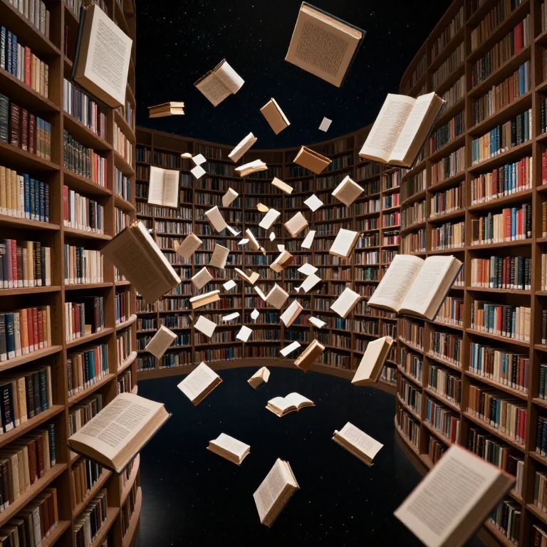 A library drifting in space, its floating books filled with living narratives that contort into new shapes as they’re read.