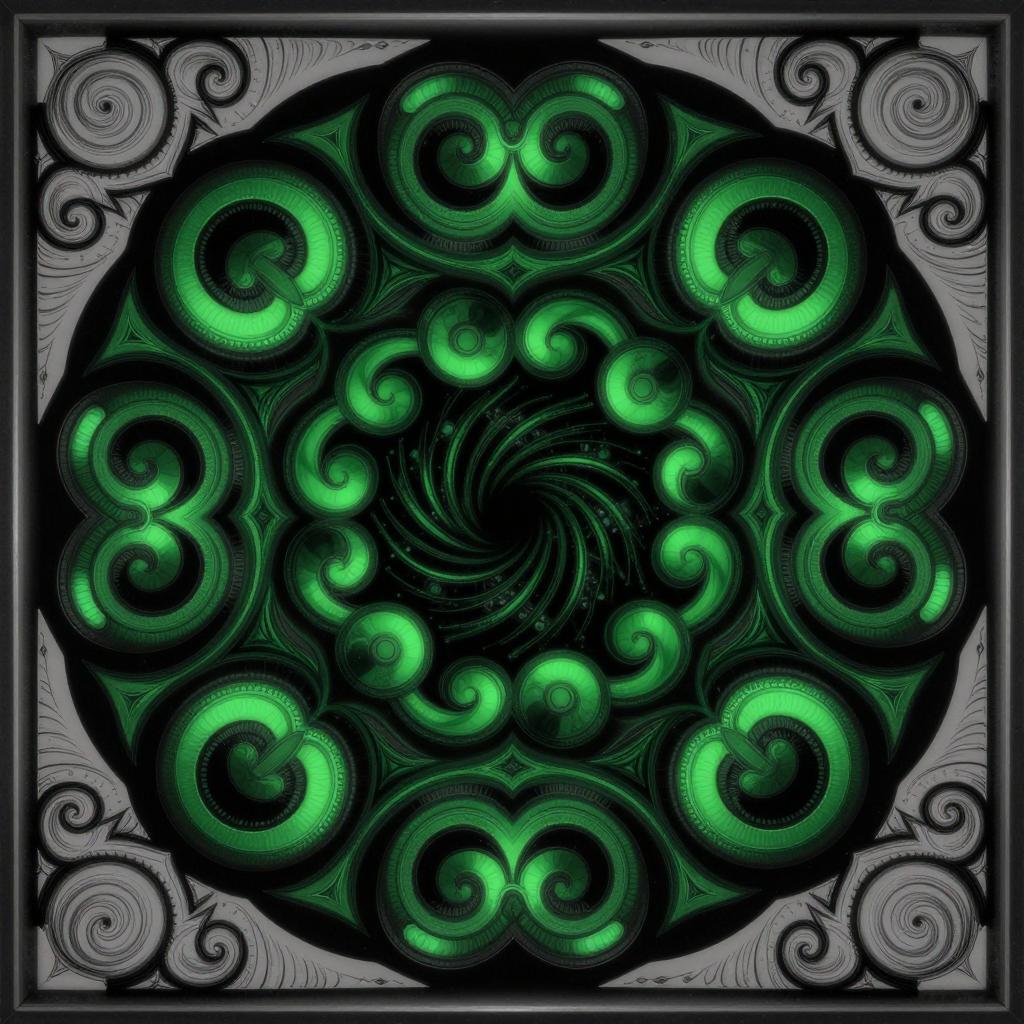 Scrollworks pattern featuring tattoo-style scrollwork with bold outlines and negative space in emerald green scrollwork on black with subtle glow arranged as spiraling scrolls forming a vortex-like composition on glass panel with frosted scroll etching rendered as engraving-style black and white etching, ultra-detailed, sharp ornamental design, high resolution, intricate decorative pattern art