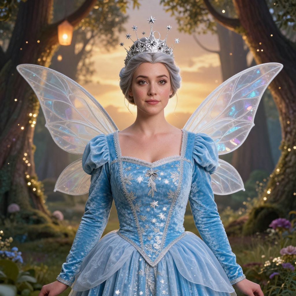 A cinematic portrait of a woman dressed as a blue fairy godmother in a complete costume: full blue velvet dress, silver embroidery, a fairy crown with tiny sparkling stars, and delicate magical wings extended behind her; she has a gentle face with soft features, freckles, and a serene expression, standing in a magical forest with floating lanterns and trees that shimmer under a golden summer sunset.. The woman has big tits and cute face