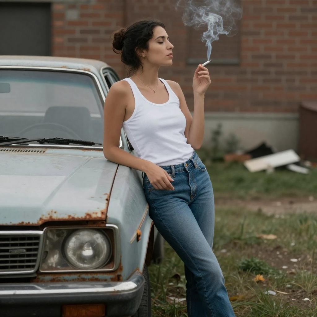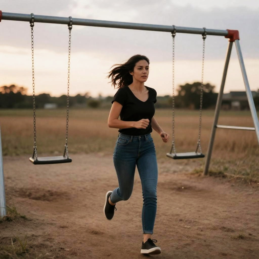 Photograph of a woman with dark hair, wearing a striped long-sleeve shirt and blue jeans, standing in a grassy cemetery. She looks over her shoulder, hands on a chain belt. Two stone graves are in the background, one in the foreground and one to the right. Iron fence behind her.