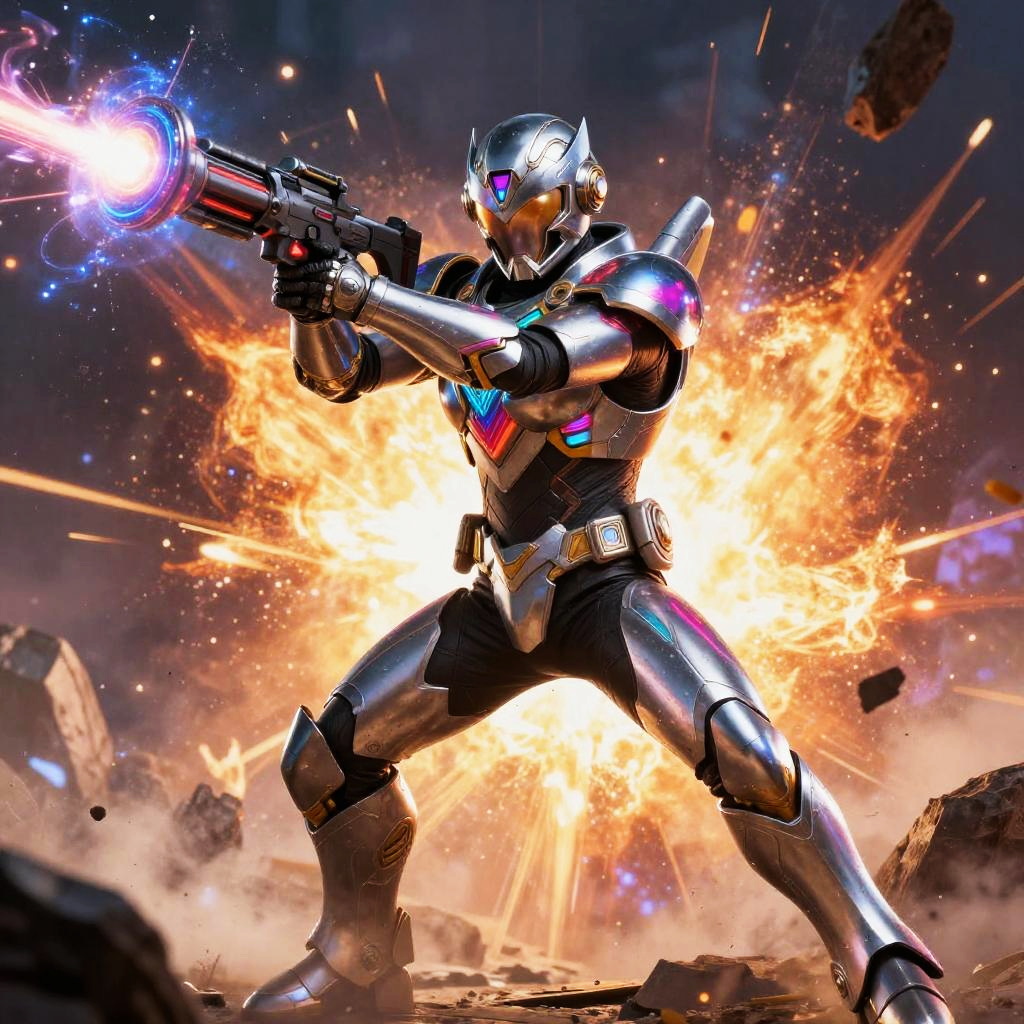 Astral blaster wielded by armored space warrior, neon lights reflecting off metallic armor, dynamic action pose, explosive cosmic battle in the background, intense vivid colors