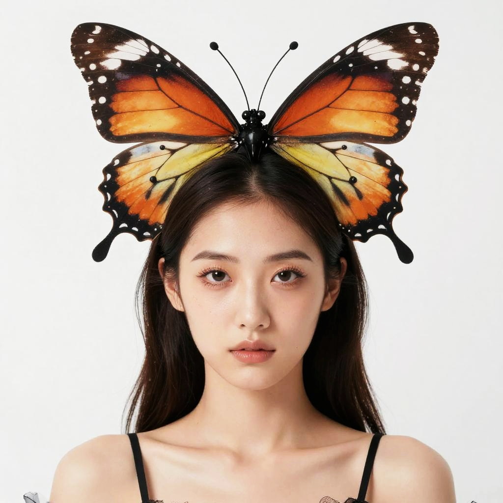Bug Fancy Dress, a close up of a woman wearing a costume with a butterfly on her head
