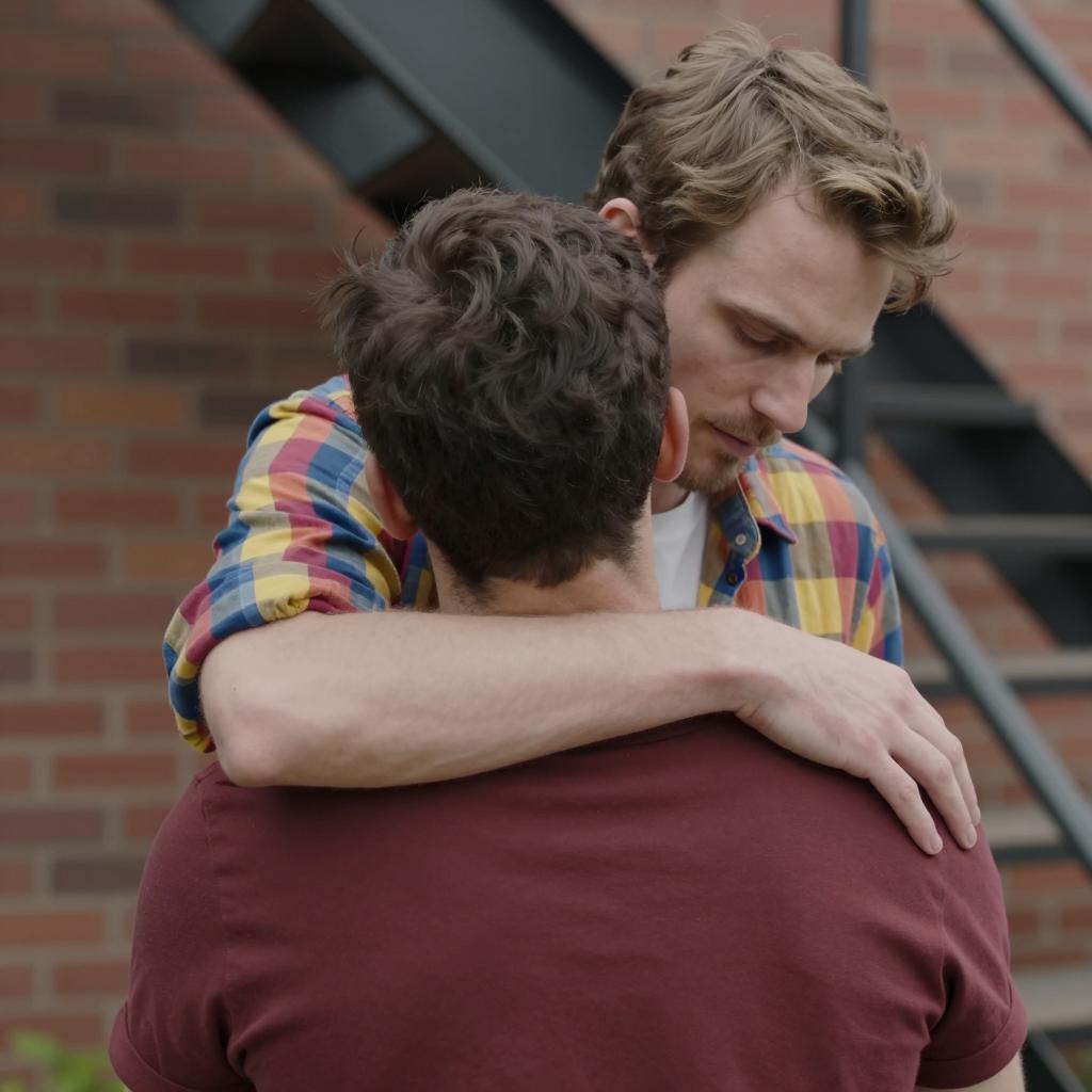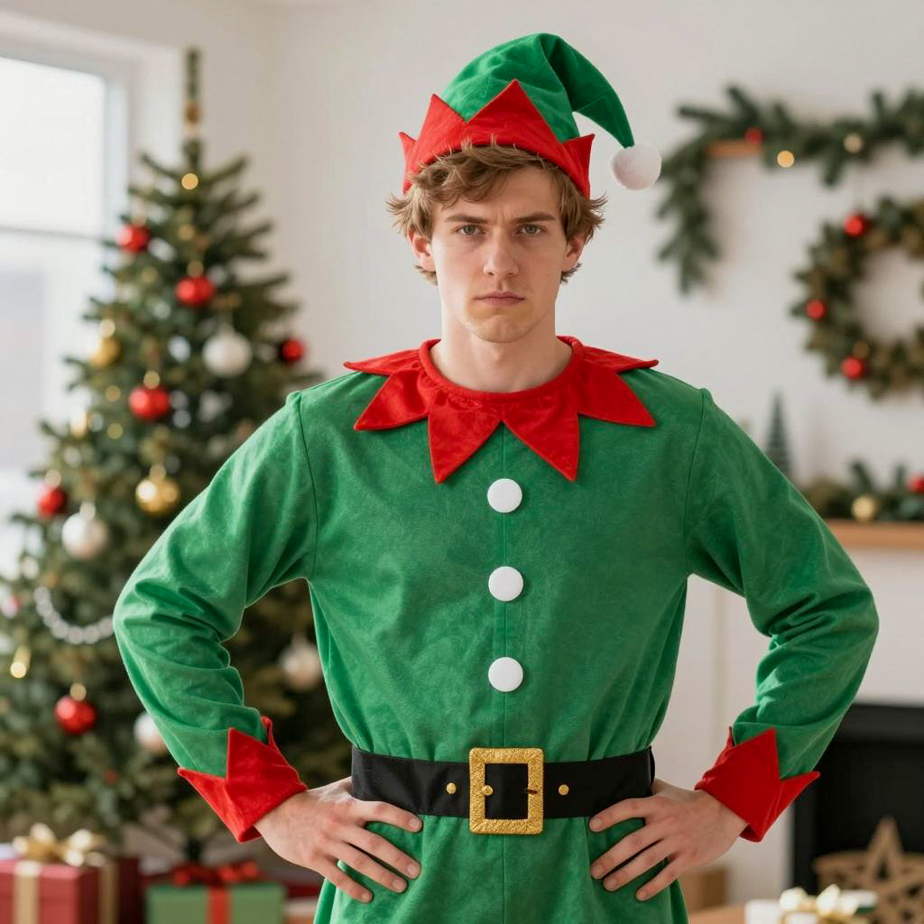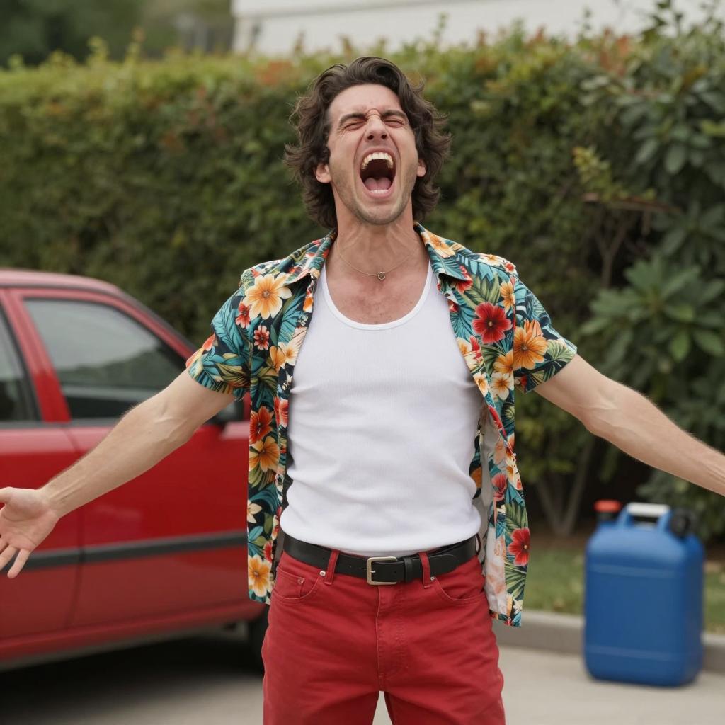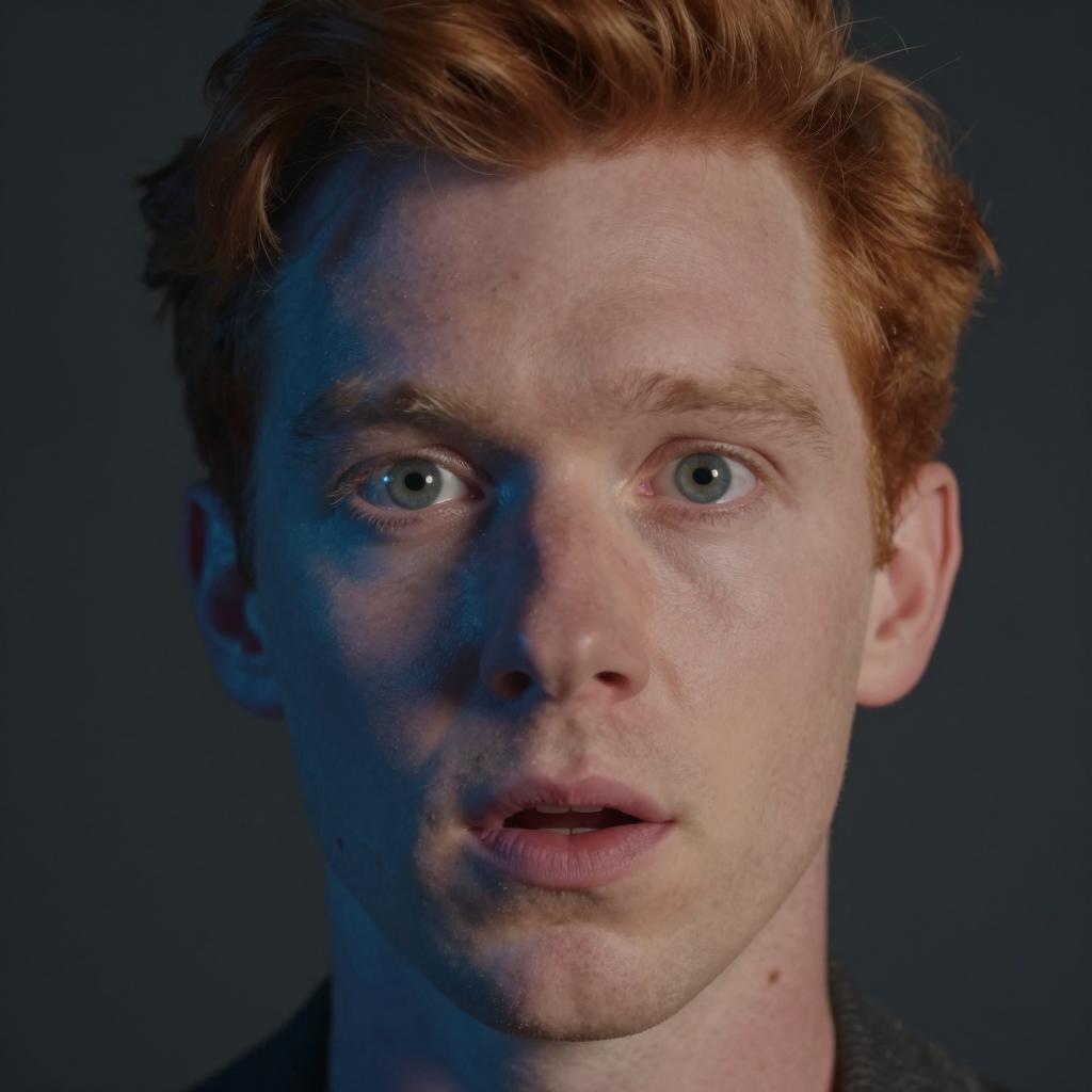 Man with short brown hair and a surprised expression, mouth open, wearing a patterned shirt with red, black, and white geometric designs. Female with red hair, back to camera, in blurred background. Warm indoor lighting. Man centered, slightly to the left. Number of people: 2. Visual style: photograph.