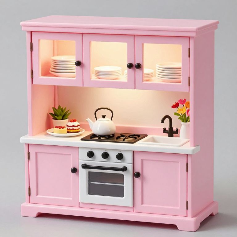 DIY American Girl Lighted Bakery Case featuring a pastel pink cabinet with glass-fronted upper doors containing neatly stacked white plates, a central oven with black knobs and handle, a faux stovetop with a teapot, a sink with black faucet, and a countertop adorned with a plate of desserts and a potted plant, complemented by a vase of colorful flowers to the side.