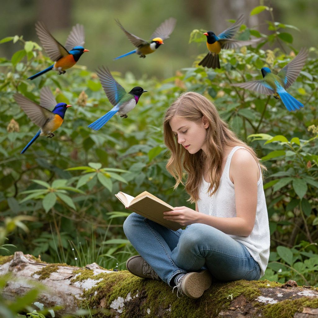 Photograph of a young woman with long, light brown hair, wearing a white sleeveless top and blue jeans, sitting cross-legged on a moss-covered log in a lush, green forest. She is intently reading a book, with a serene expression. Surrounding her are seven brightly colored birds with blue, orange, and yellow plumage, in mid-flight. The background is filled with dense, green foliage, creating a peaceful, natural setting. The sunlight filters through the trees, casting soft, dappled shadows on the scene.