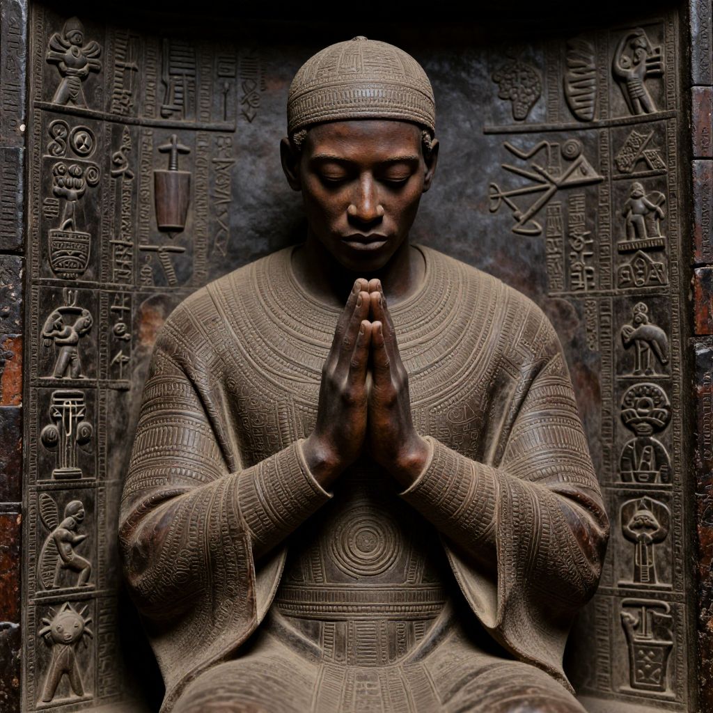 The image depicts a highly detailed and intricate sculpture of an African man in a prayerful pose, reminiscent of Leonardo da Vinci's style. The man is seated with his hands clasped together in front of him, his head slightly bowed in a gesture of reverence. His attire is richly textured, featuring intricate patterns and designs that add depth and dimension to the sculpture. The background is adorned with a complex array of symbols and inscriptions, further enhancing the sense of depth and historical significance. The overall composition is balanced, with the man centrally positioned and the surrounding elements carefully arranged to create a harmonious visual narrative. The interplay of light and shadow on the man's face and clothing highlights the meticulous craftsmanship and attention to detail in the sculpture.