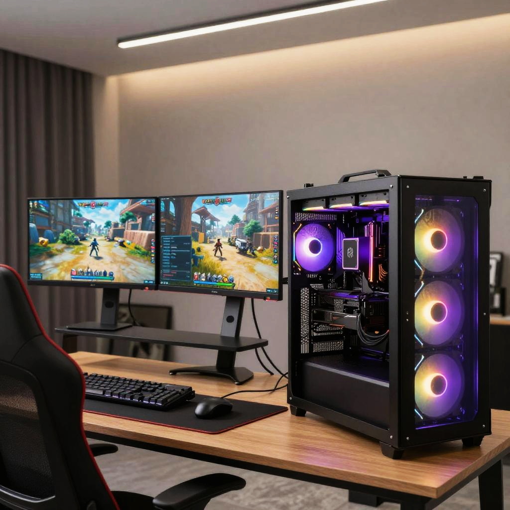 Modern gaming setup: dual monitors displaying a vibrant game, black tower PC with illuminated purple lights, on a wooden desk, under fluorescent lighting, with a