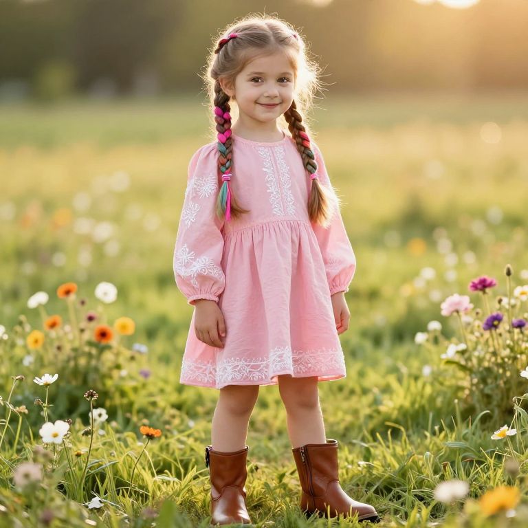 A young girl with vibrant, intricate braids in her hair, wearing a soft pink dress adorned with delicate white embroidery along the sleeves and hem, and matching brown leather boots that add a cozy, stylish touch. She stands confidently in a sunlit meadow, her face slightly turned toward the viewer with a warm, cheerful expression, surrounded by blooming flowers and a golden afternoon glow, exuding innocence and charm.