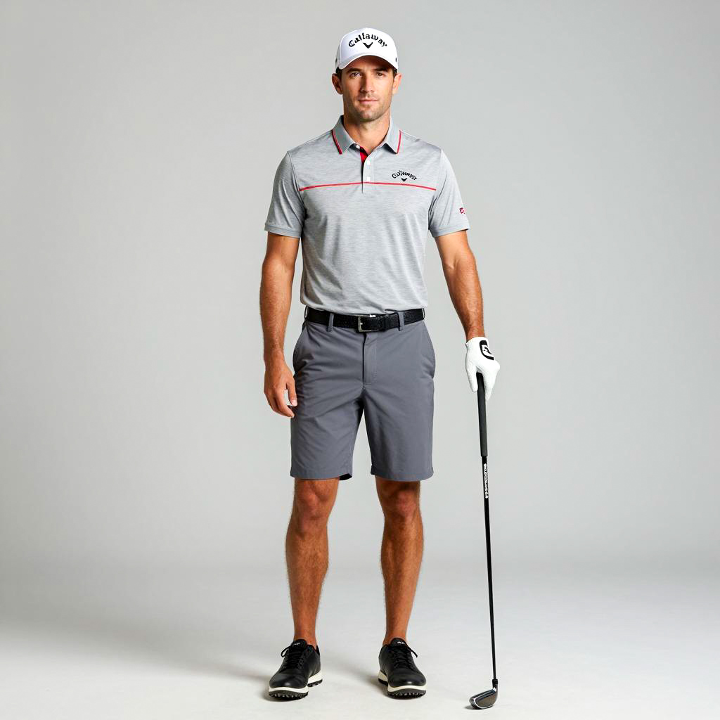 Callaway golf costume, photograph of male golfer, standing, full body, gray polo shirt, red accents, gray shorts, black belt, white cap, gray glove on left hand, holding golf club in right hand, black shoes, neutral background, studio lighting, realistic style, daytime, athletic build, casual, professional golfer attire