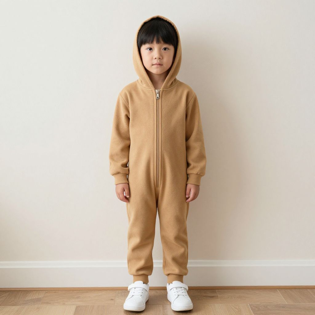 Photograph of an Asian toddler standing against a plain white wall. The child has straight black hair with bangs and is wearing a light brown, full-body zip-up hoodie with the hood up, matching brown pants, and white sneakers. The child stands with a neutral expression and arms relaxed at their sides. The floor is light wooden laminate. The image has a minimalistic style with soft lighting, highlighting the child's outfit and the clean, simple background. The overall composition is centered and balanced.