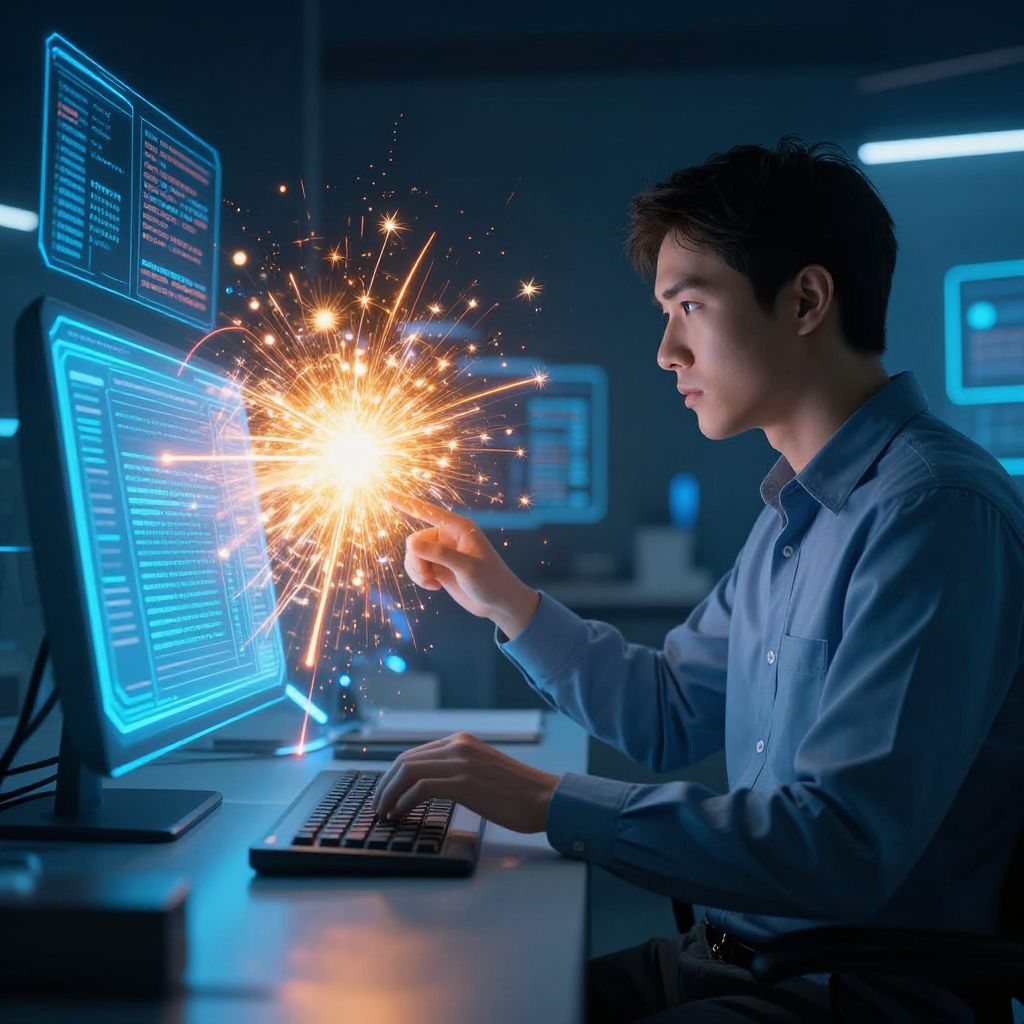AI prompt hot: A high-energy AI studio scene where a human engineer interacts with a glowing interface, typing a hot AI prompt that responds instantly with animated visuals, sparks, and real-time data projections.