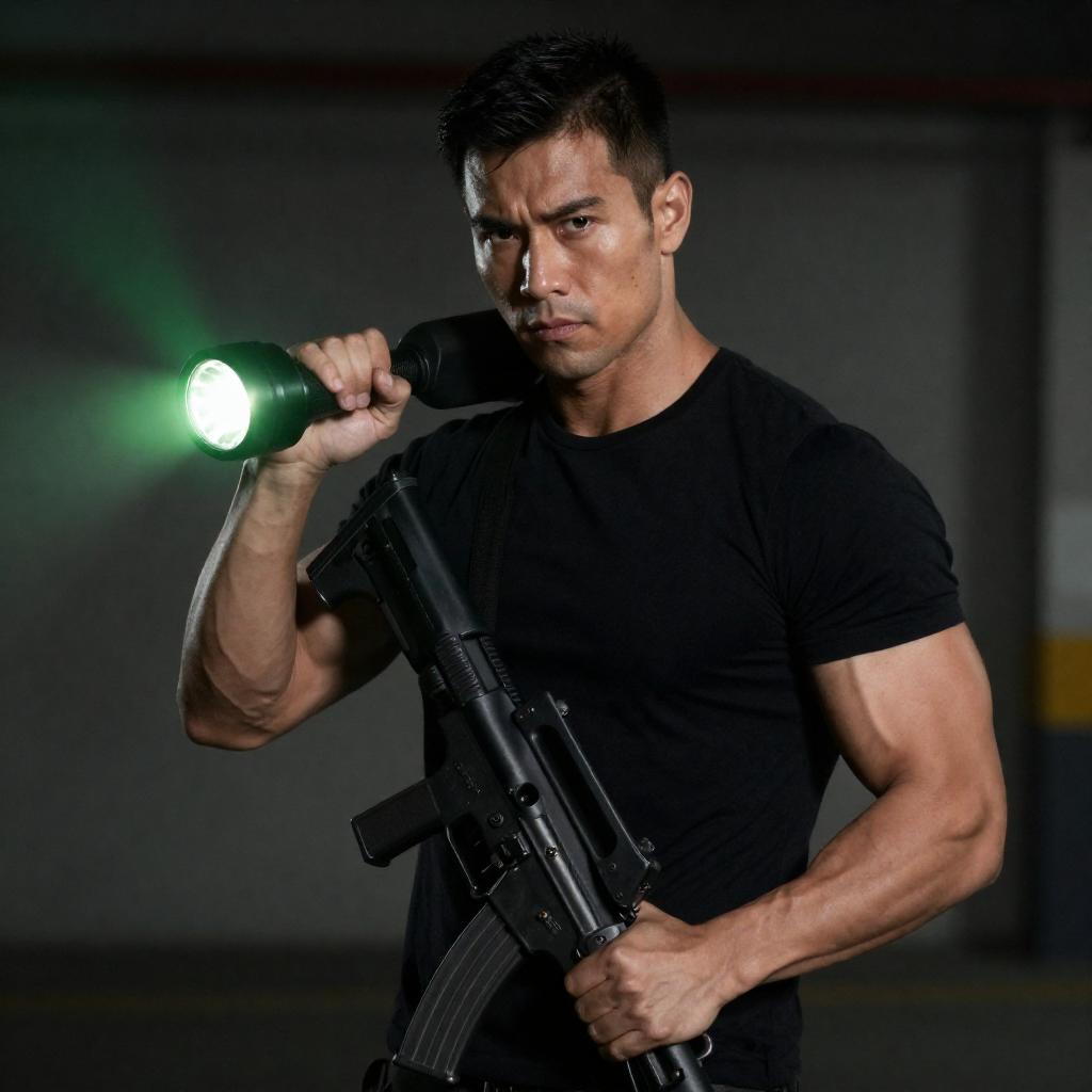 Photograph of a muscular man with short dark hair, wearing a black shirt, holding a large, glowing green flashlight in his left hand and a black assault rifle in his right. He stands in a dimly lit, industrial background with a serious expression. The flashlight's light illuminates his face and upper body.