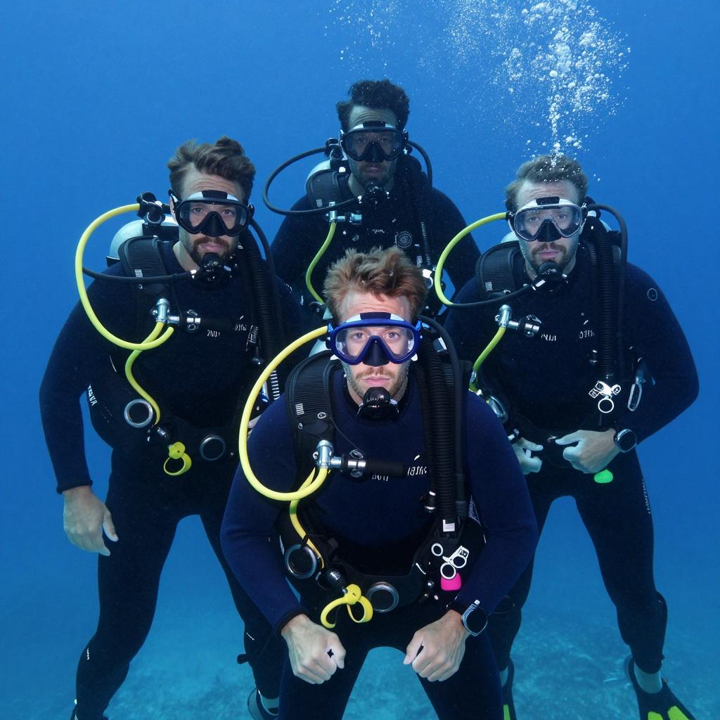Photograph of five men in scuba gear with oxygen tanks. Four men stand behind a fifth man in the foreground, all with serious expressions. Blue, cloudy underwater background. Men wear dark, rugged clothing with gloves and face masks. The man in the front has glasses and short brown hair. The other men have various haircuts and beards.