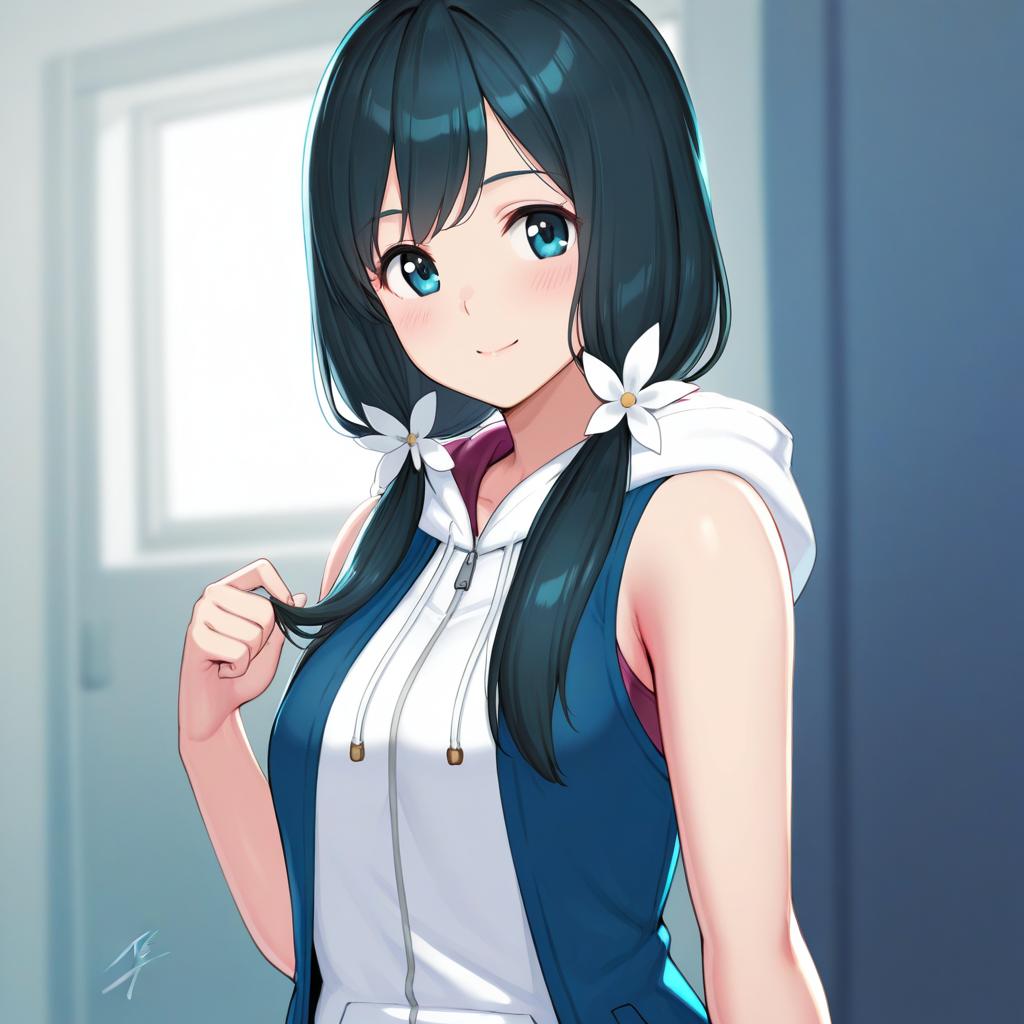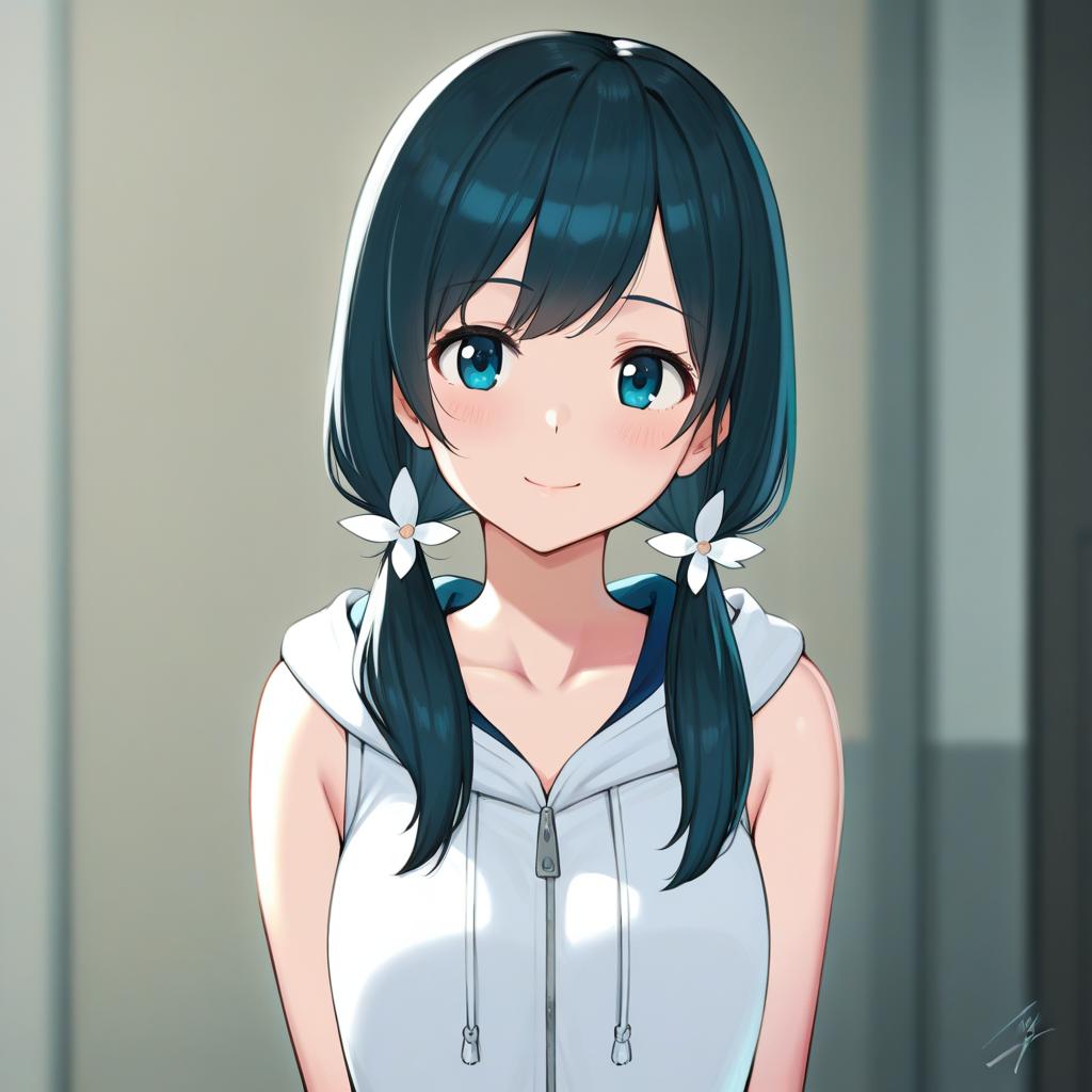 Digital illustration of a young anime girl with long, dark blue twintails adorned with white flower hair ties. She has bright blue eyes, a soft smile, and wears a sleeveless white zip-up hoodie with the hood down, exposing bare arms. The artwork features a soft, neutral background highlighting the character's gentle expression and detailed hair shading.