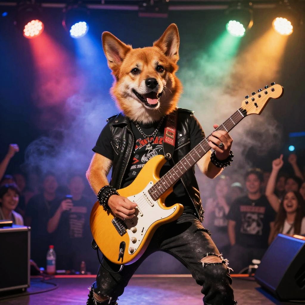 Photograph of a corgi in a black leather jacket and ripped jeans, playing a sunburst electric guitar on stage, surrounded by colorful lights and