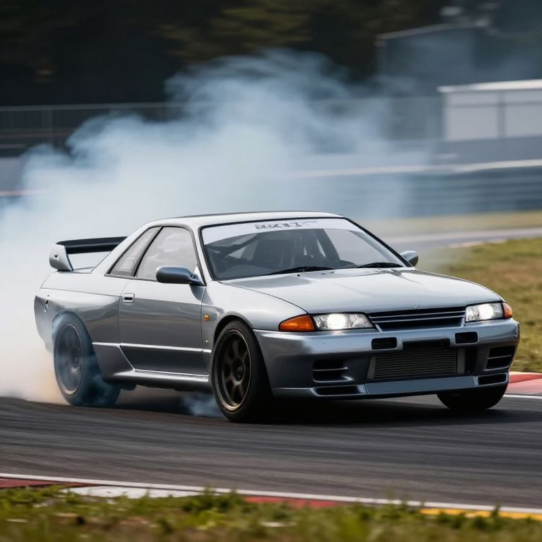 Nissan R-32 drifting on a race track, smoke billowing from tires, intense action shot capturing angular motion, dynamic lighting with highlights on body contours, emphasizing precision driving and high performance in a competitive motorsport scene.