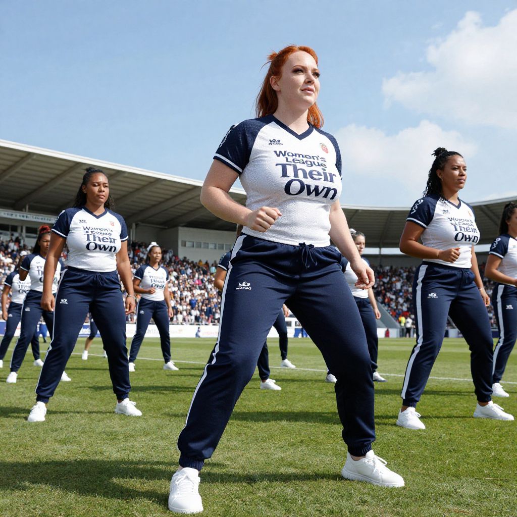 Outdoor stadium setting, a strong-looking woman with red hair and a sharp facial expression wears the 'Women's League Their Own' uniform with full kit — breathable jersey, team pants, and white shoes — as she practices a drill with her squad under a bright blue sky with team spirit visible in the crowd.. The woman has big tits and cute face