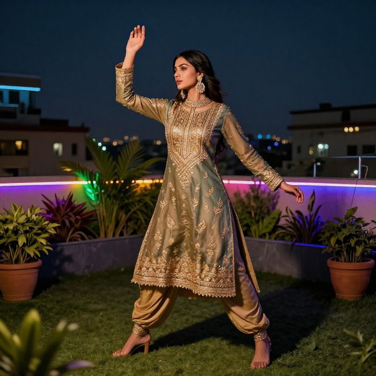 Punjabi suit gemini prompt: A stylish Punjabi suit with gold embroidery, worn by a charismatic Gemini in a rooftop garden in Lahore, surrounded by greenery, neon lights, and a mystical aura, blending tradition with futuristic elements, photorealistic, dynamic pose, rich colors.