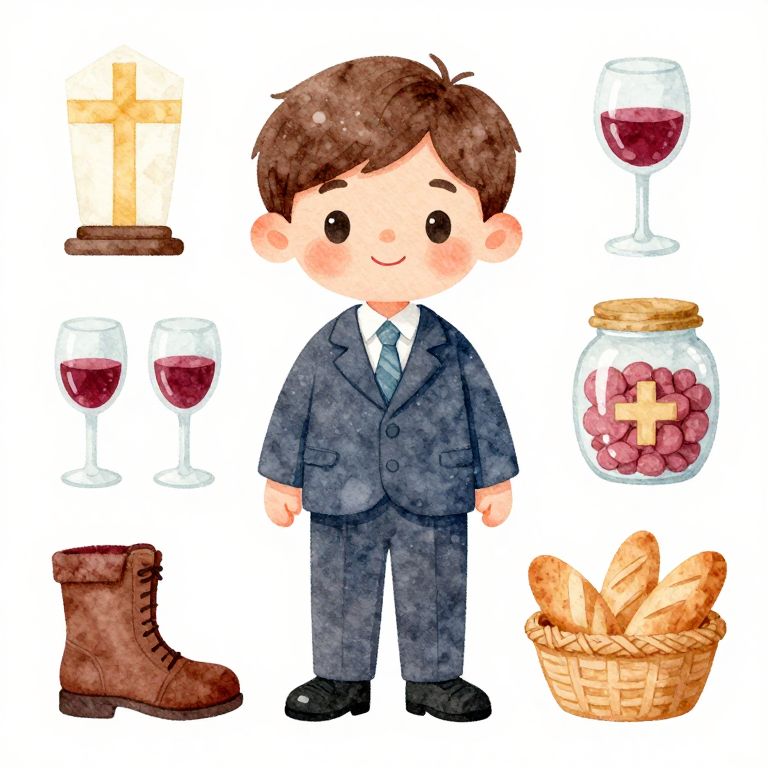 A watercolor illustration of a boy in a suit, surrounded by First Communion clipart elements such as a boot, a glass of wine, a jar, and a basket of bread.