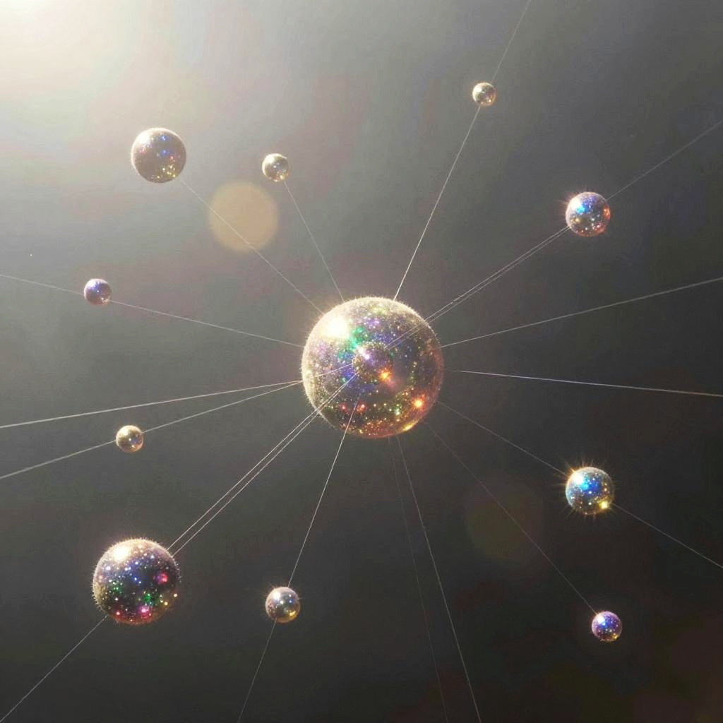 A visual representation of a quantum realm, shimmering particles, interconnected strings, 8k panoramic view, foggy and sunny, shifting light states, inspired by Gustave Courbet, El Greco, Mary Cassatt