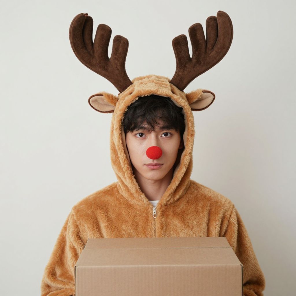 "reindeer plush costume, solo, antlers, 1boy, male focus, animal costume, reindeer costume, red nose, box, reindeer antlers, cosplay, christmas, standing, horns, realistic Realistic photo of casual sexy person with pretty face"