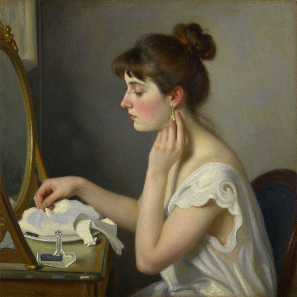 Painting of a fair-skinned woman with brown hair in a bun, wearing a blue lace-trimmed dress, applying perfume at a vintage vanity
