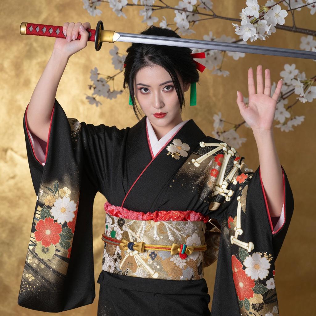 Photograph of a woman in traditional Japanese kimono with intricate bone and flower patterns. She holds a red-hilted katana overhead, with black hair adorned with red and green ribbons. Golden background with white cherry blossoms. She has fair skin and intense gaze. Her right hand grips the katana's hilt while her left hand is raised, fingers splayed. Her kimono is black with gold and red accents. She stands centrally, facing forward.