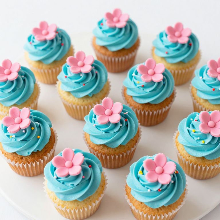 Twelve vibrant cupcakes, each topped with swirls of light blue frosting, delicate pink fondant flowers, and colorful sprinkles, are artfully arranged on a pristine white surface, creating a whimsical and festive display.