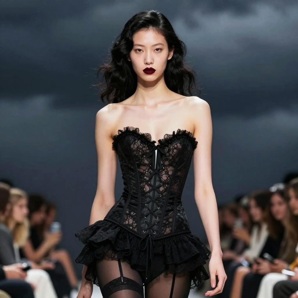 A photograph of a striking fashion model with pale skin and dark, wavy hair. She's wearing a black, strapless, lace-up corset with a ruffled skirt and sheer black stockings. Her dark red lipstick contrasts with her pale complexion. The background is a dark, stormy sky, adding a dramatic effect. The audience is blurred in the background, focusing attention on the model.