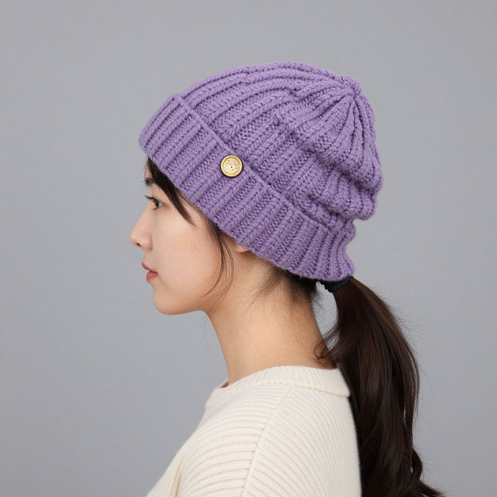 Woman wearing a cozy purple chunky knit slouchy beanie with a gold button detail, styled with a high ponytail and paired with a cream-colored ribbed sweater.