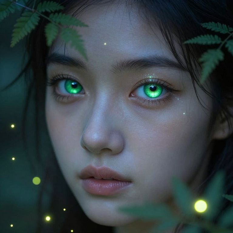 Green doe eyes sparkling under the soft moonlight, surrounded by a mystical forest with glowing fireflies, delicate foliage framing the face, ethereal and captivating gaze, highly detailed eyes with shimmering emerald hues, fantasy portrait style.