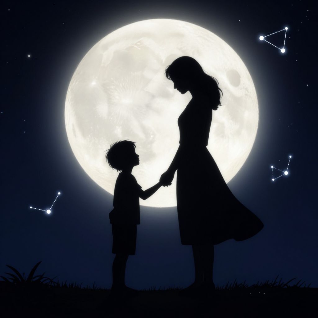 Silhouetted mother and child holding hands against a bright full moon, with constellation patterns in the starry night sky.