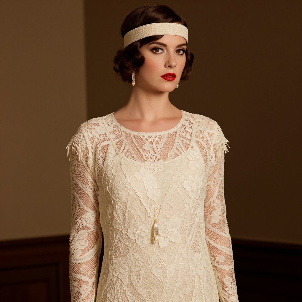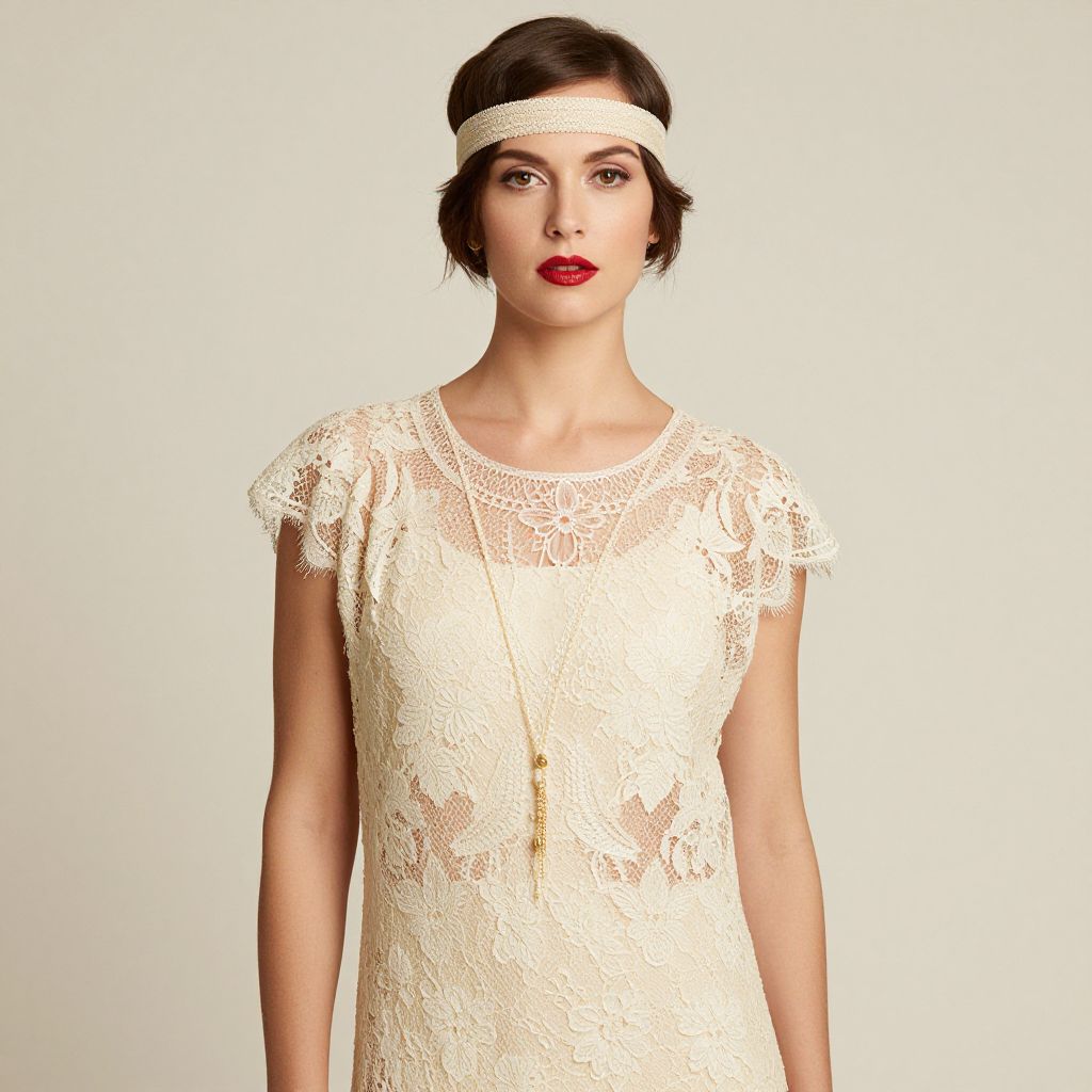 Elegant 1920s-inspired vintage fashion showcased by a woman in a cream lace dress featuring intricate floral patterns, paired with a delicate headband and bold red lipstick, embodying the glamour of the Roaring Twenties.