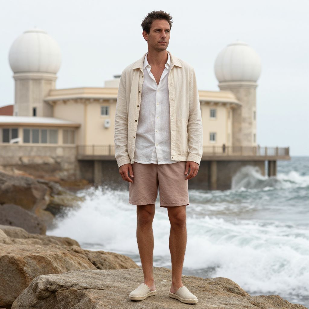 A man, relaxed-fit linen blend shirt, versatile board shorts, comfortable slip-on espadrilles, lightweight packable jacket, soft pastels with sandy beige, coastal building with radar domes, eastman film stock, contemplative expression, ocean waves crashing nearby. Man has masculine face and piercing eyes