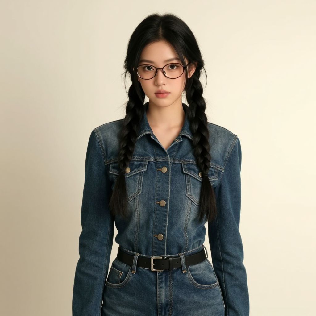 Photograph of an Asian woman with black braided hair, wearing a red cap, red zip-up dress, black belt, and silver emblem, standing
