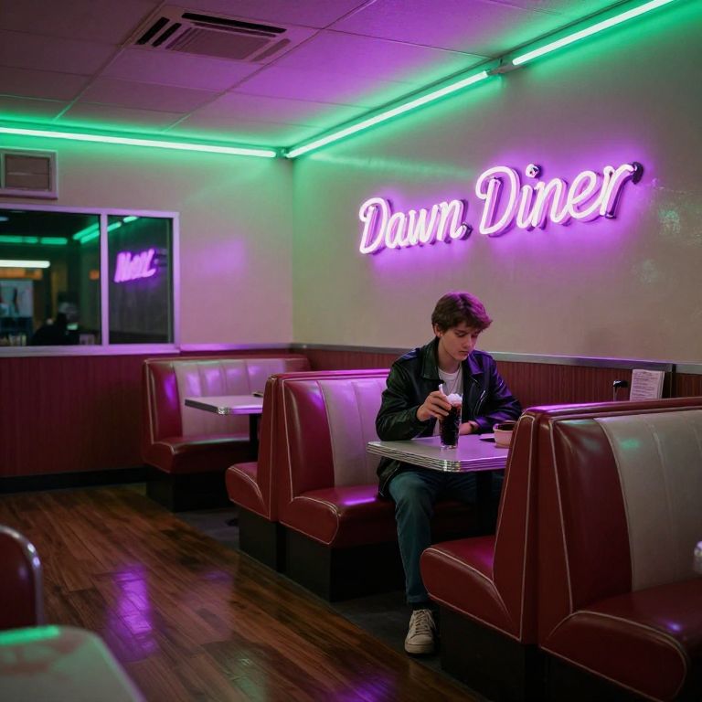 A dimly lit, retro diner interior with a ceiling full of neon tubing pulsing in purple and lime green, a teenager with short brown hair and a leather jacket sits at a corner booth, holding a frosty soda, the soft glow of the neon 'Dawn Diner' sign casting a shimmering reflection on the polished mahogany floor.