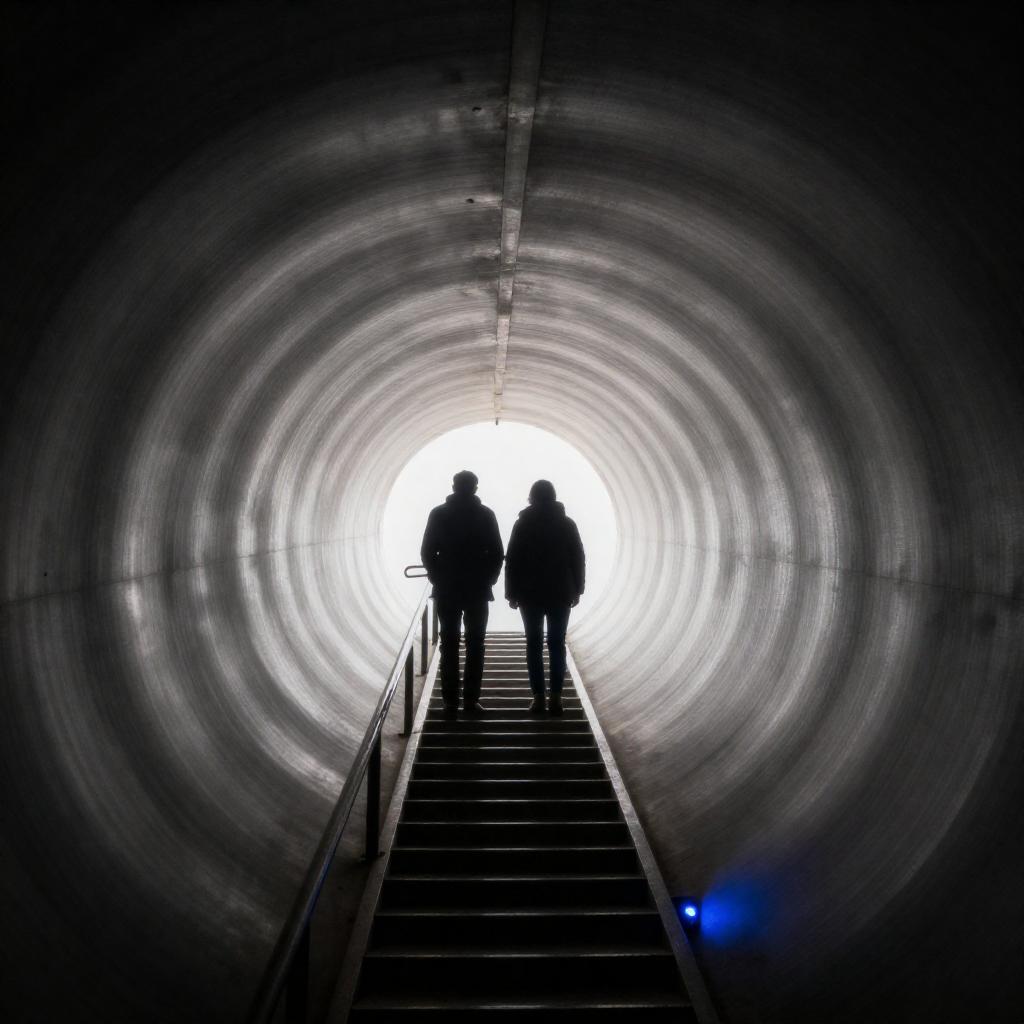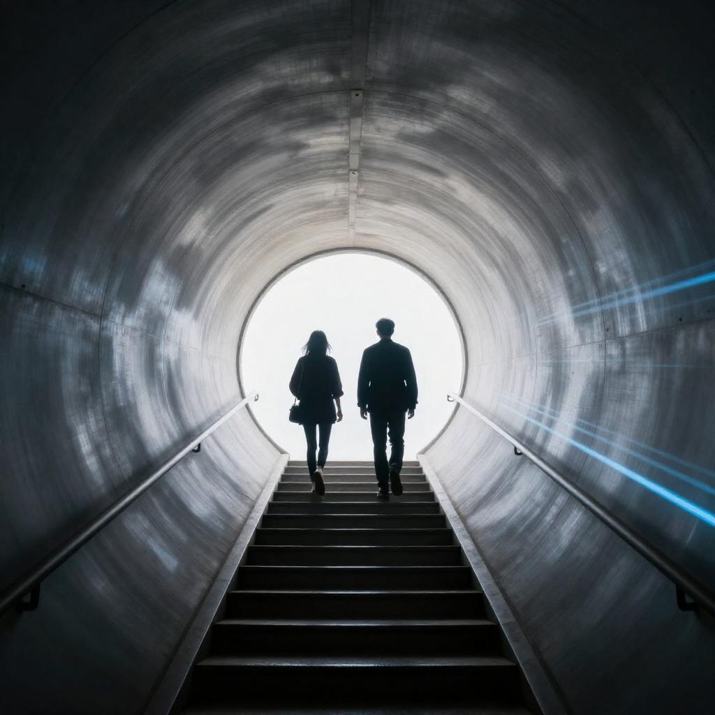 Digital artwork of a tunnel with metallic, reflective walls. Two silhouetted figures stand at the tunnel's end, illuminated by bright white light. A metal staircase leads up to them, with blue light streaks on the right. The tunnel's circular, mirrored ure creates a dynamic, futuristic atmosphere.