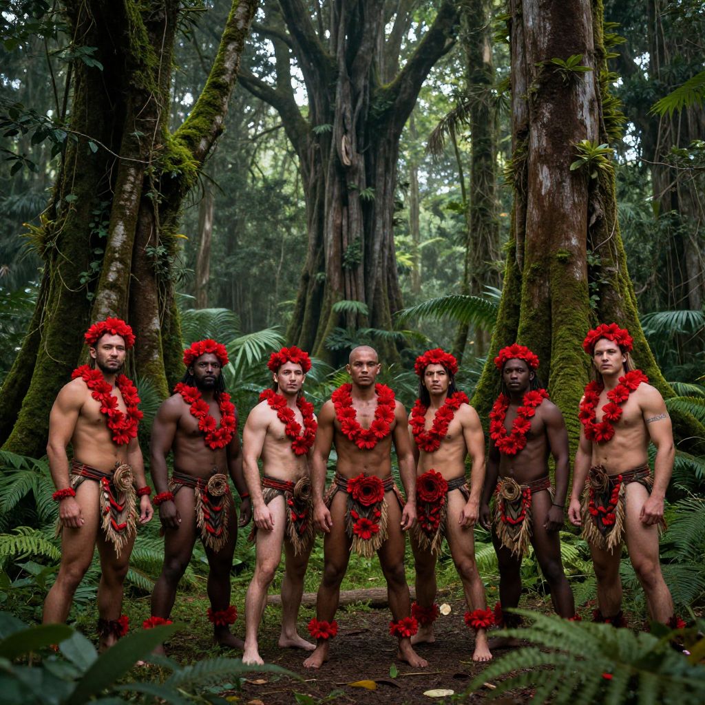 Photograph of six muscular, shirtless men standing in a dense, lush forest. They wear red flower lei necklaces and matching loincloths adorned with small feathers. Their skin is dark, and they all have long, straight black hair. The background features tall, moss-covered trees and abundant green ferns. The men stand in a straight line, with three on each side of two central figures. The lighting is natural, with dappled sunlight filtering through the forest canopy, creating a vibrant, tropical atmosphere. The men's focused expressions and confident stances suggest a tribal or ceremonial setting.