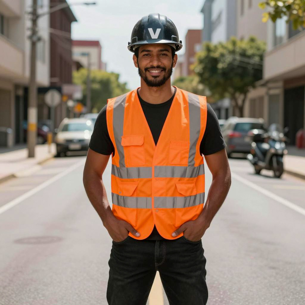 Roadman outfit costume, photorealistic, standing male construction worker, daytime, urban street background, bright orange safety vest with reflective stripes, black shirt, black pants, black safety helmet with white "V" on front, hands in vest pockets, smiling, short beard, brown skin, background includes blurred buildings, street, trees, scooter, sunny weather, clear sky, summer, realistic ures, casual pose, construction industry attire, street setting
