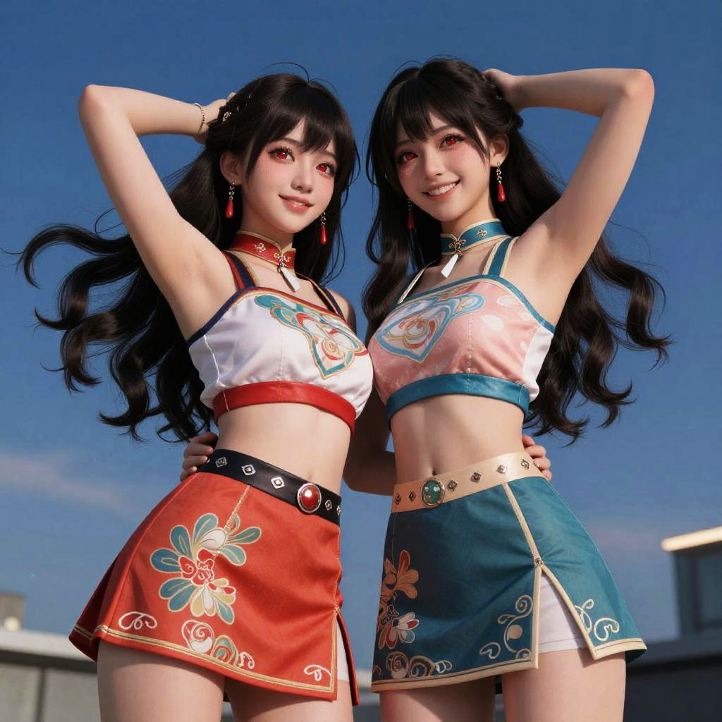 Photorealistic CGI image of two young Asian women with long, black wavy hair, standing outdoors against a clear blue sky. Both wear crop tops with floral designs and matching short skirts; the woman on the left has a red skirt with white and yellow flowers, while the woman on the right has a green skirt with similar floral patterns. They both have fair skin, red and pink eye makeup, and are smiling with hands raised behind their heads. They wear red and green chokers, respectively, and have delicate earrings. The background includes a blurred rooftop.