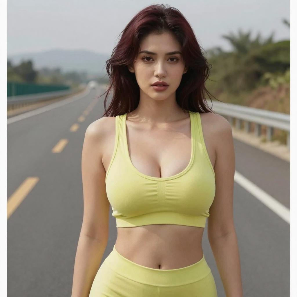 Basety style, cowboyshot, 1girl, (23 years old beautiful woman), Plum hair, huge breast, thin waist, wide pelvis, Chartreuse clothes, highway, delicate, cinematic light, realistic details, sharp focus, detailed skin, clear image, medium shot