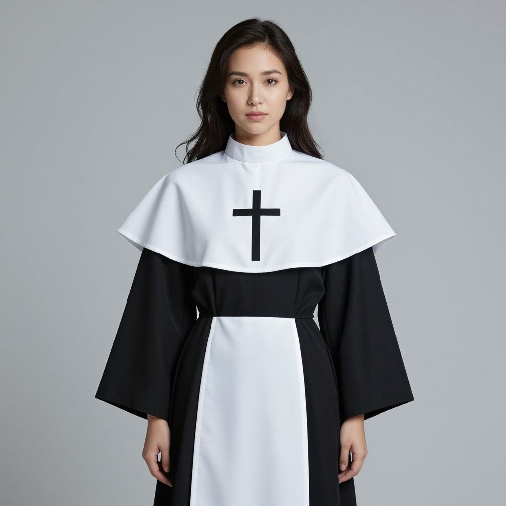 Modern Female Clergy Attire Costume, woman in a black and white robe and a cross