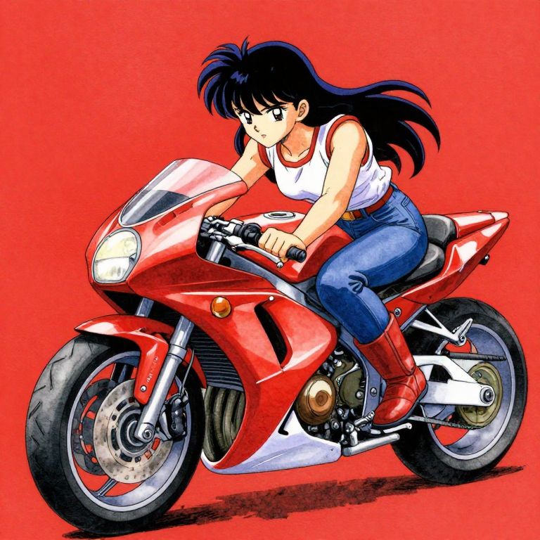 Anime-style illustration of a black-haired woman with a white tank top and blue jeans riding a red sport motorcycle against a bright red background.